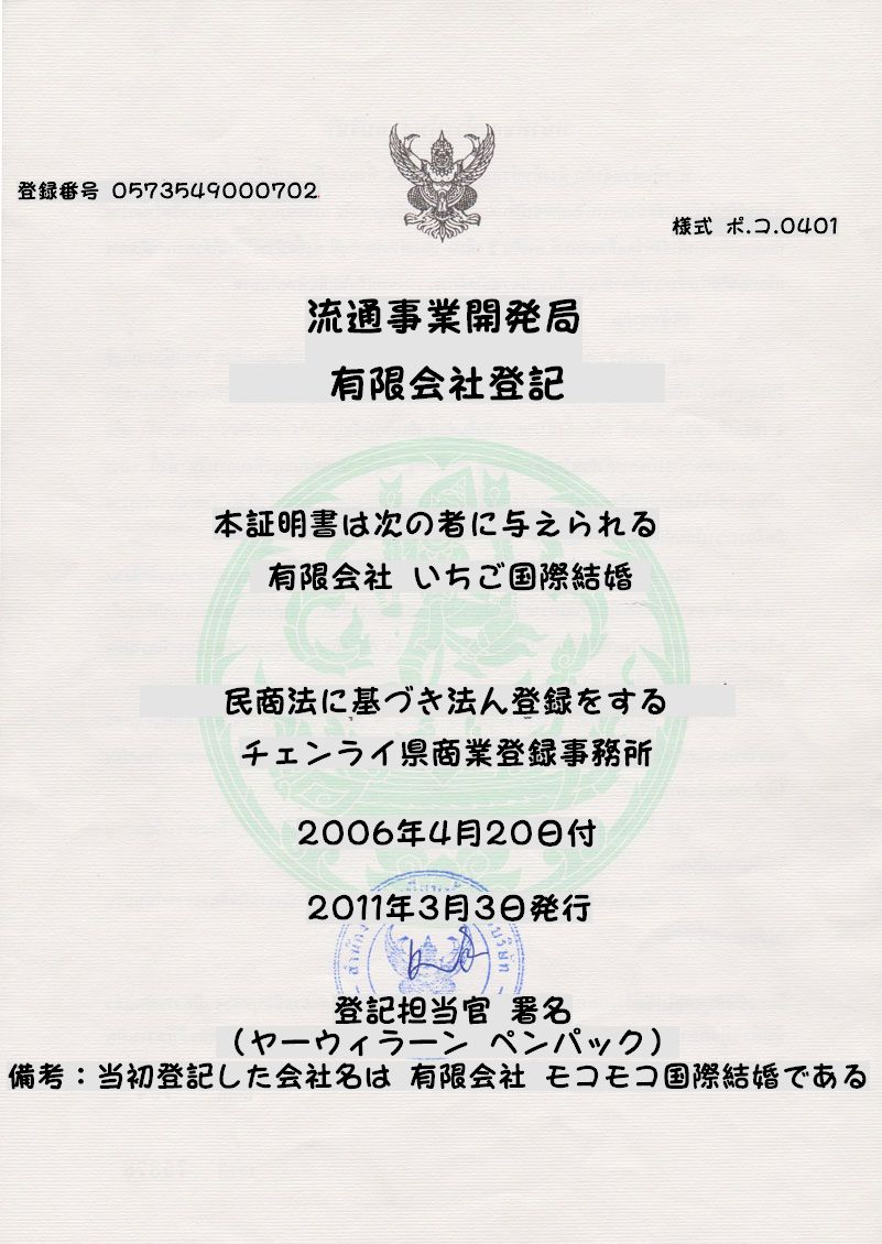 | 沿革 | 2005年12月 東京都足立区に事務所設立 2006年 4月 タイ国チェンライ県に事務所設立 2006年 5月 ホームページ開設 2011年 3月 タイ国チェンライ県の社名をモコモコ国際結婚からいちご国際結婚へ変更 2011年 7月 東京都足立区から千葉県松戸市に事務所を移転する 2016年 1月 業務統合に伴い、千葉県松戸市の事務所を閉所する |